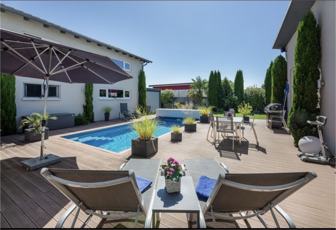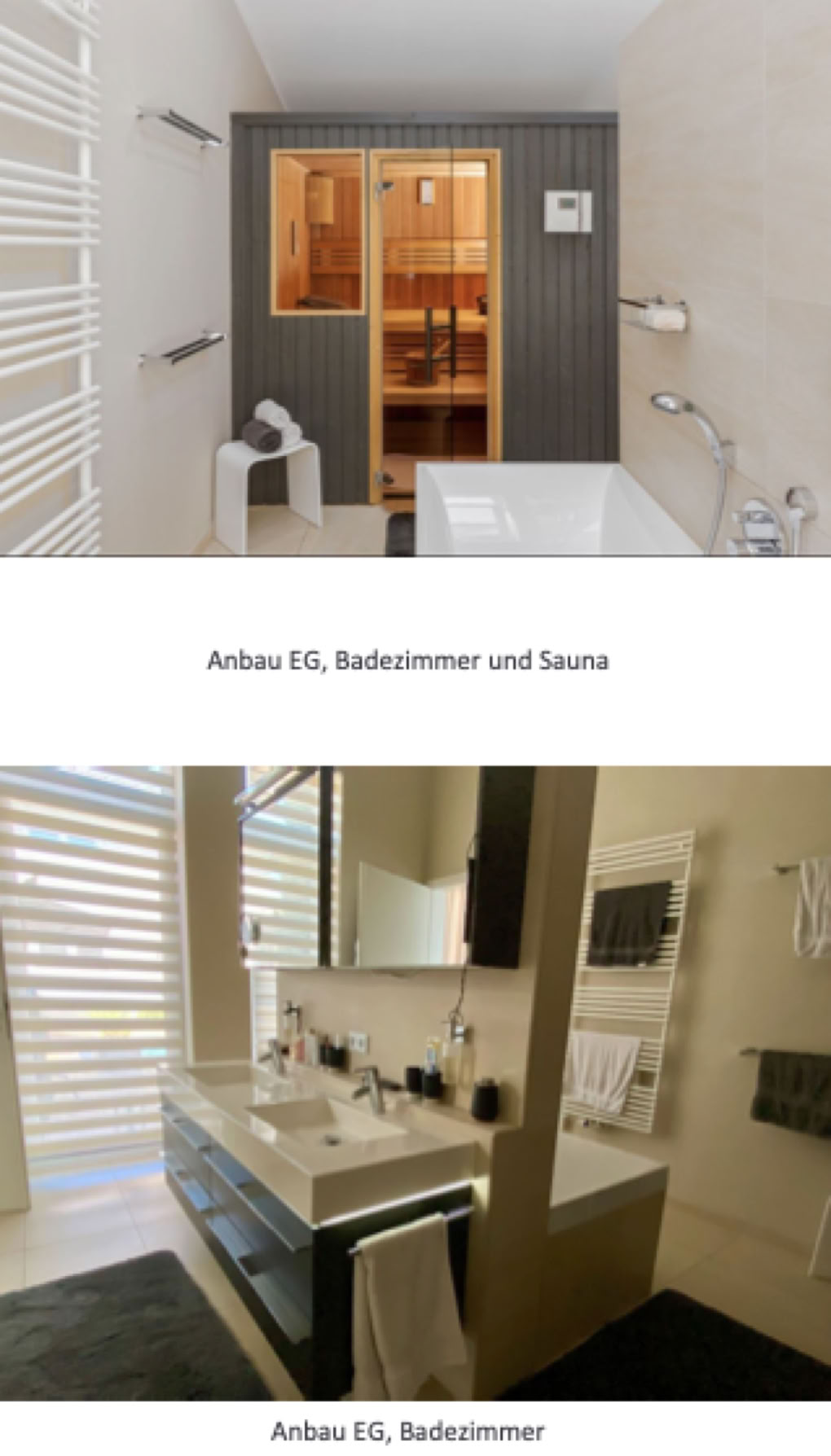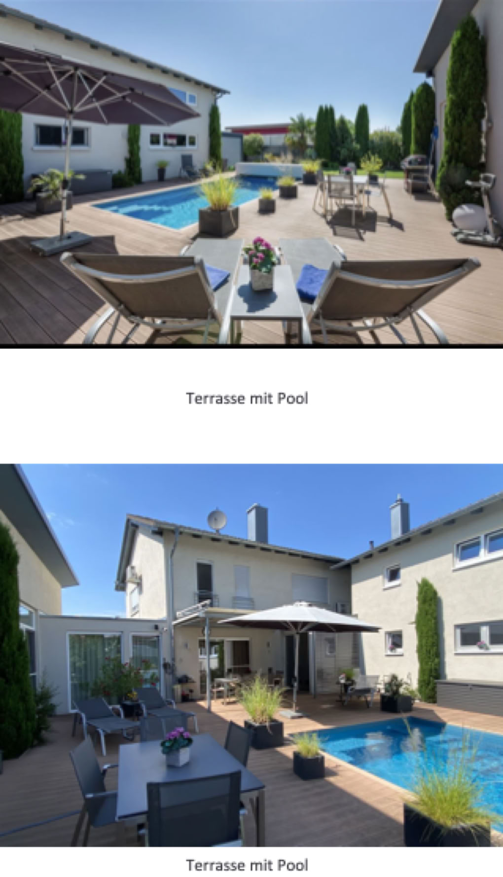 Dieses großzügige Wohnhaus bietet mit ca. 243 m² Wohnfläche plus einem vielseitig nutzbaren Anbau (ca. 74 m²) ein Raumangebot, das in dieser Form selten zu finden ist. Ob als Einfamilienhaus mit luxuriösem Komfort, als Zuhause für mehrere Generationen oder als Wohnen und Arbeiten unter einem Dach – hier stehen Ihnen alle Möglichkeiten offen. Das Herzstück bildet der offene Wohn- und Essbereich mit stilvollem Kamin und gleich zwei modernen Einbauküchen. Von hier gelangen Sie auf die weitläufige Terrasse mit beheizbarem Pool (Keramikwanne mit 3D-Oberfläche) – perfekt für entspannte Stunden im eigenen Wellnessbereich. Ergänzt wird dieser durch ein elegantes Bad mit Sauna, Wanne und Dusche. Die private Rückzugsebene im Obergeschoss bietet drei weitere Schlaf- bzw. Kinderzimmer, zwei Bäder sowie ein Ankleidezimmer. Ein großes Büro mit eigener Küchenzeile und Duschbad kann zudem in eine eigenständige Einliegerwohnung verwandelt werden. Der 2014 errichtete Anbau beherbergt ein weiteres Schlafzimmer, einen Fitness- und Ankleidebereich – ideal für Gäste oder als separater Wohnbereich. Komfort und Sicherheit sind selbstverständlich: Klimaanlage in den Schlafräumen, Garage mit elektrischem Tor und direktem Hauszugang, zusätzlicher Carport (2014), fünf weitere Stellplätze, eingezäuntes Grundstück mit Alarmanlage und Videoüberwachung.